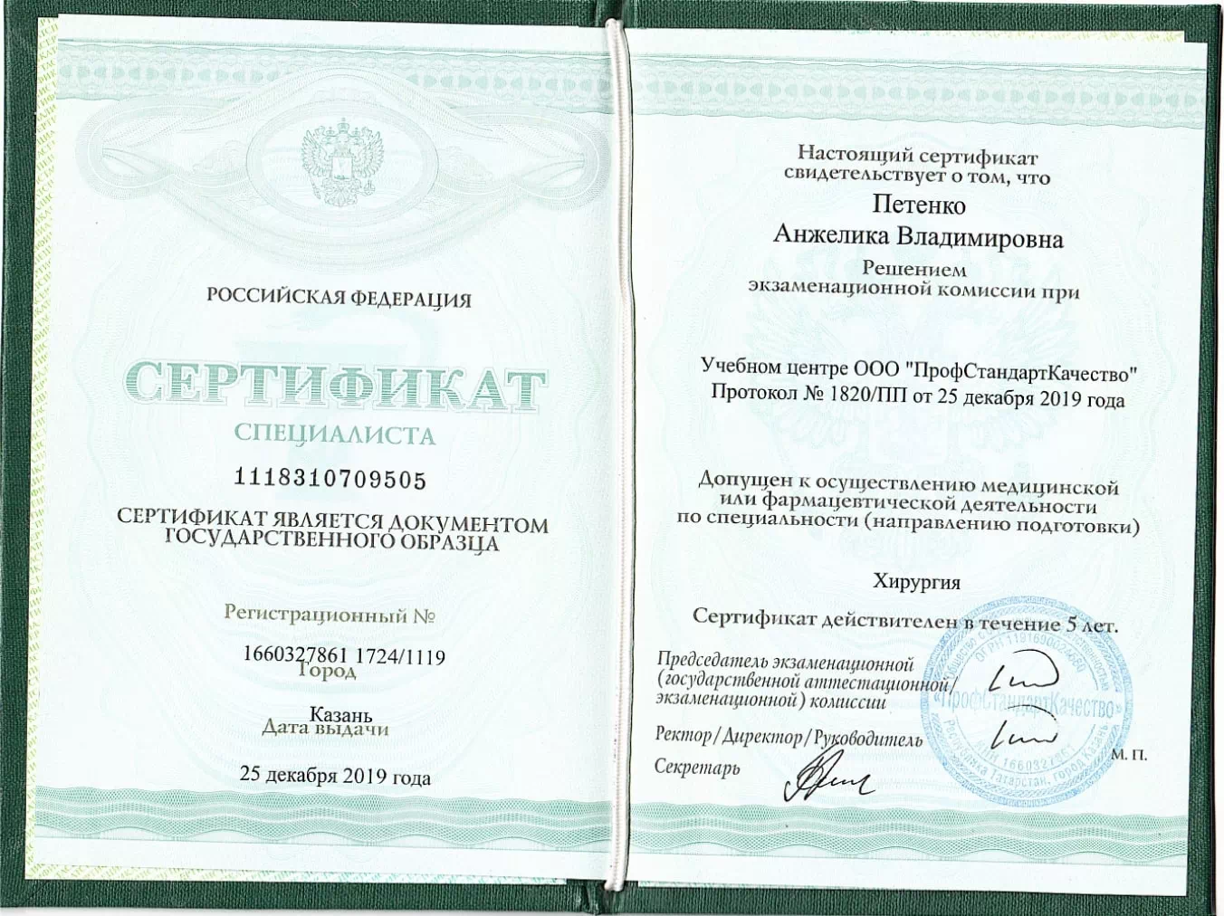 • 2019 — ПрофСтандартКачество (квалификация: врач-хирург);